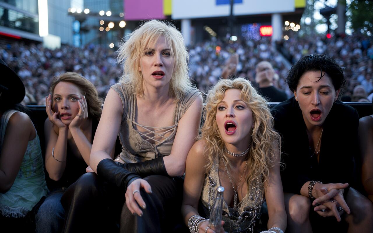 As the ceremony wound down and guests filtered out, Love made her move. She spotted Madonna mid-interview with MTV’s Kurt Loder on a platform just outside the venue and decided to crash the party. Armed with makeup compacts from her purse, Love literally threw herself into the live broadcast, creating television gold in real time.